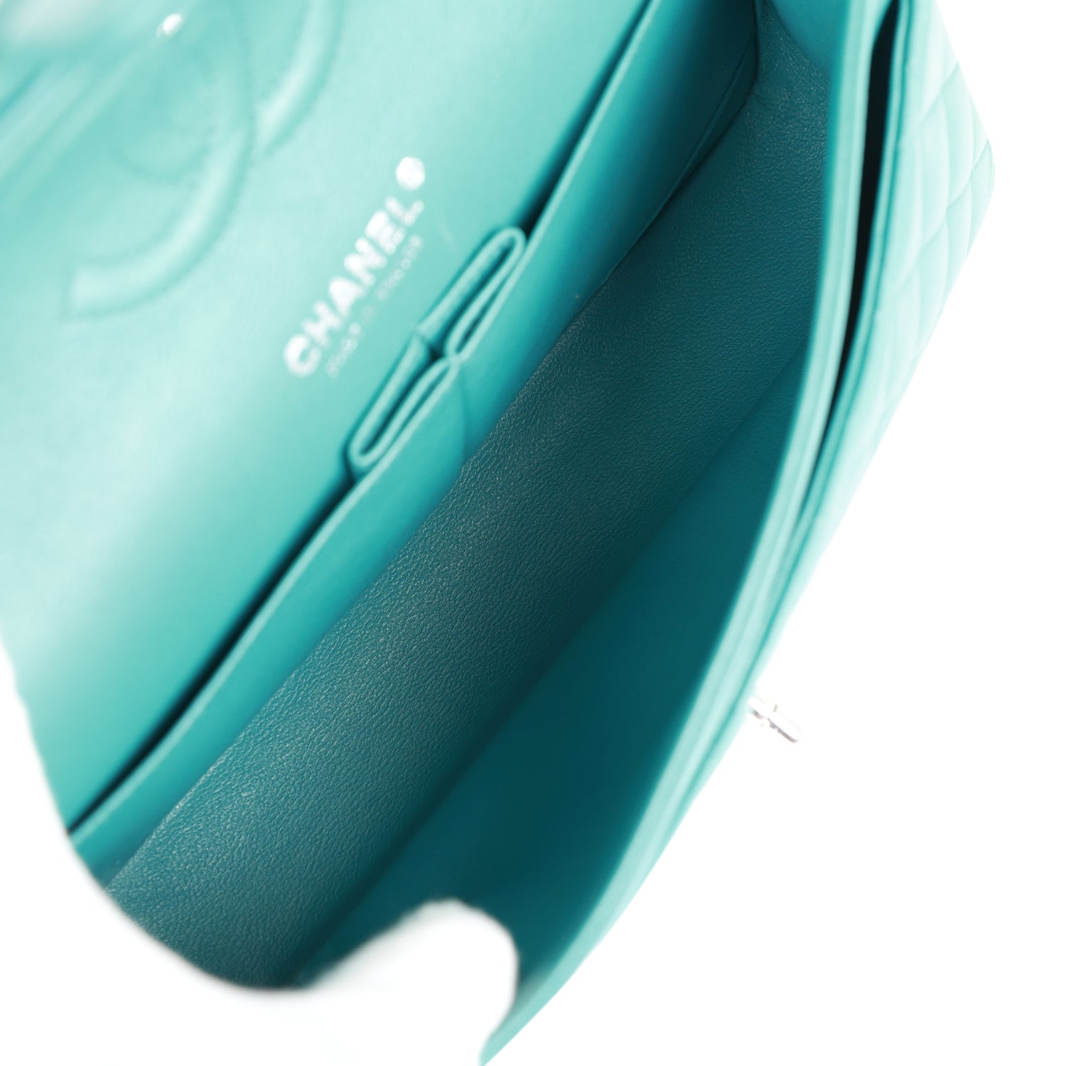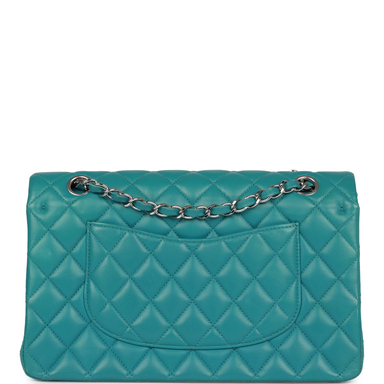 This Medium Classic Double Flap bag is in Blue lambskin leather with silver tone hardware and features a front flap with signature CC turnlock closure, half moon back pocket, and adjustable interwoven silver tone chain link and blue leather shoulder strap.