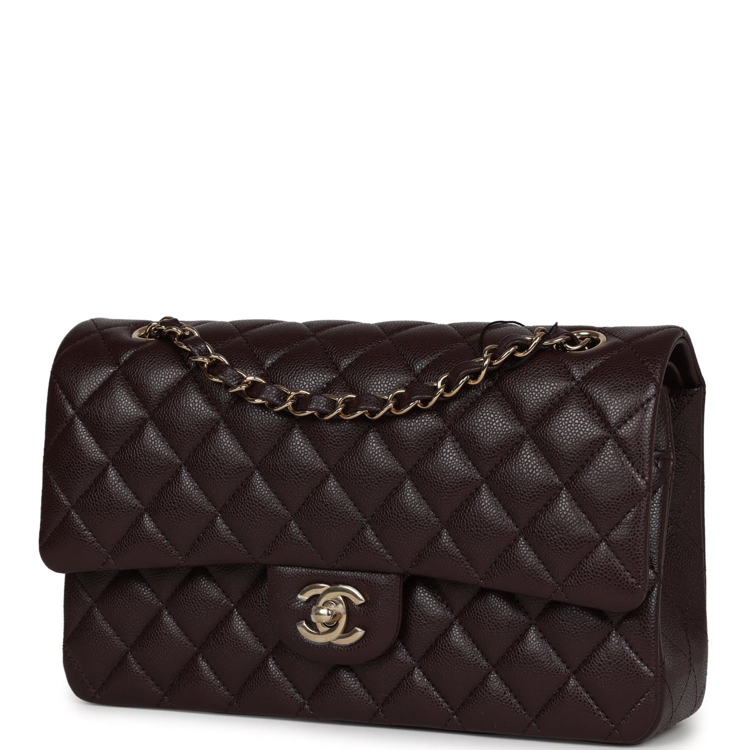 This Medium Classic Double Flap Bag is in Dark Purple Caviar leather with Gold Hardware, front flap with CC turnlock closure, tonal stitching, half moon back pocket and an adjustable interwoven light gold chain link and dark purple leather shoulder/crossbody strap.