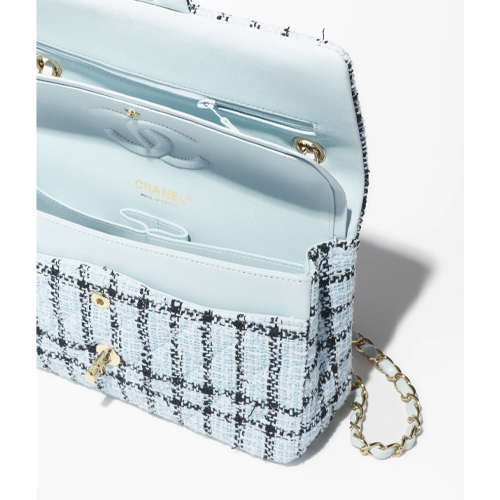 This season, the classic 11.12 bag silhouette is reinterpreted in the brand’s signature tweed. The light blue and black tweed fabric creates an elegant, modern look. The 25.5cm gold size (15.5 x 6.5cm) and 24K gold-plated hardware perfectly embody Chanel’s timeless aesthetic.