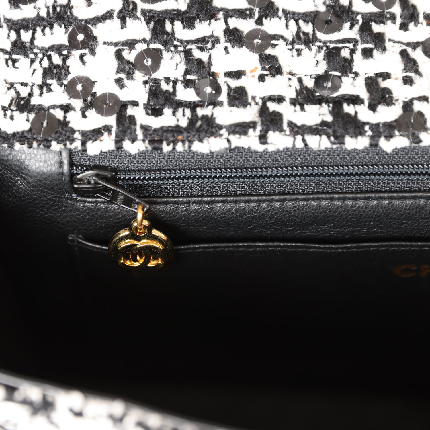 Vintage Chanel Kelly Parent Flap Black and White Sequin Tweed Gold Hardware